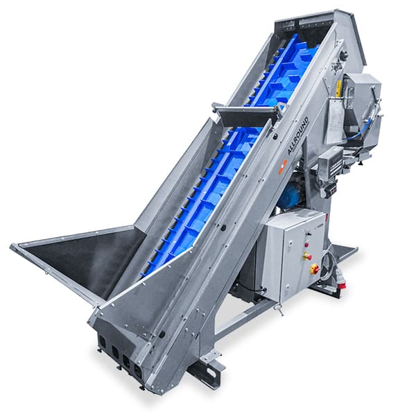 The weighing machine is designed for weighing. The produce is transported diagonally up by a belt towards a bin.Wheels are included so the machine can easily be moved.