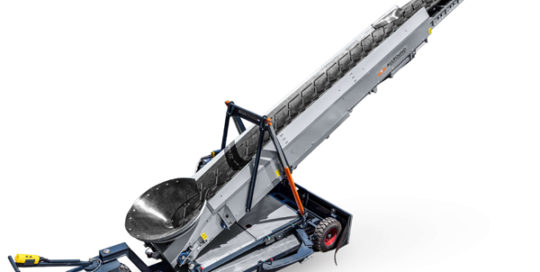 The mobile transporter is designed to transport produce upwards efficiently. Its height can be adjusted manually. The conveyor belt is made of durable rubber with chevron-type cleats.