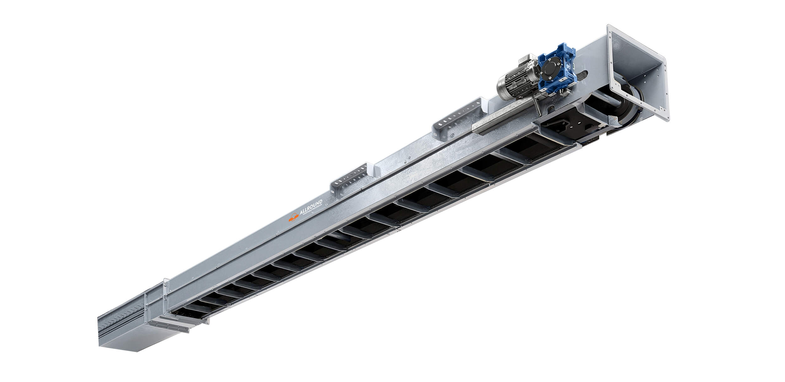 The system uses a scraper chain mechanism that moves the waste smoothly through the conveyor, ensuring reliable and continuous waste handling.